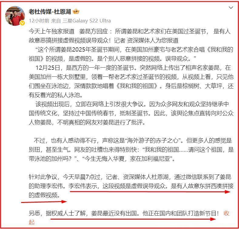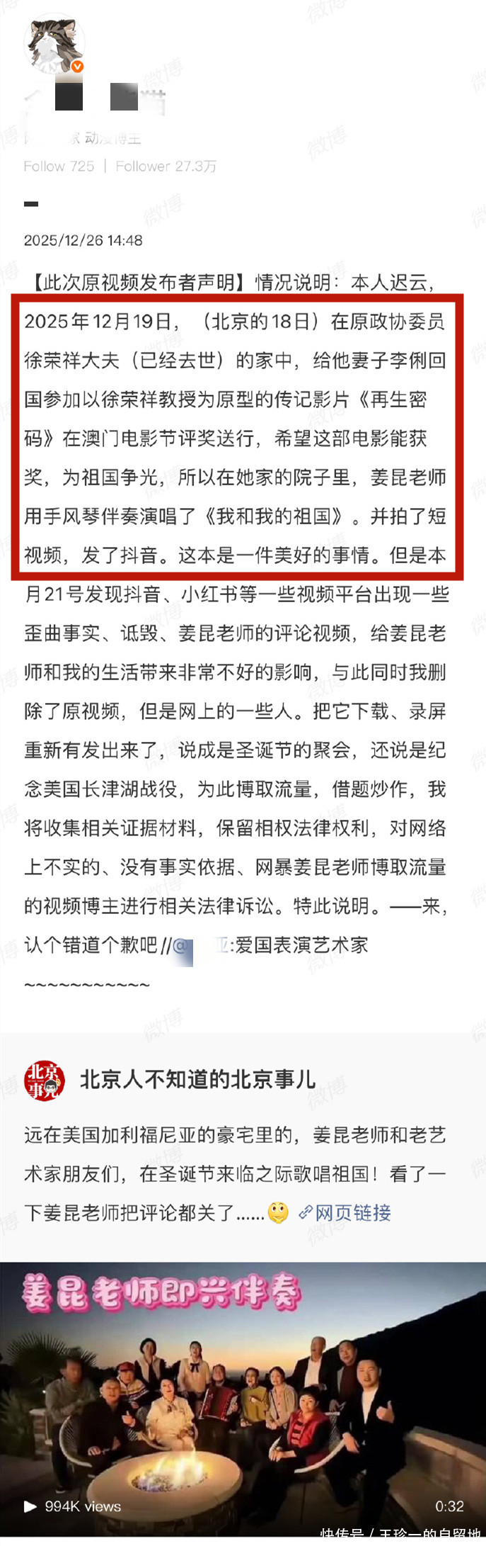 彼时,有多位博主发视频称姜昆在美国和一众老艺术家聚会过圣诞节,并且一起演唱了《我和我的祖国》,在美国祝祖国圣诞快乐。