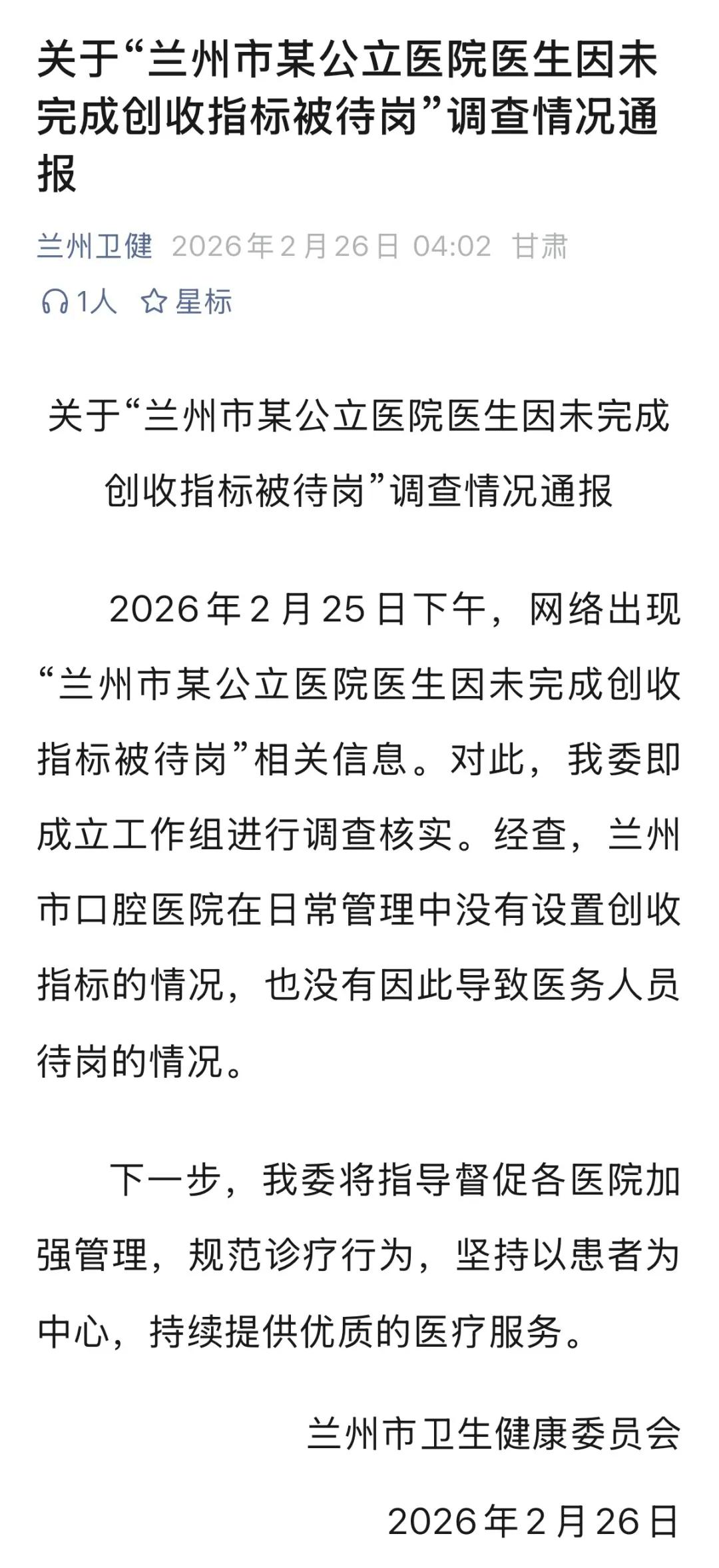 2026年2月25日下午,网络出现“兰州市某公立医院医生因未完成创收指标被待岗”相关信息。对此,我委即成立工作组进行调查核实。经查,兰州市口腔医院在日常管理中没有设置创收指标的情况,也没有因此导致医务人员待岗的情况。