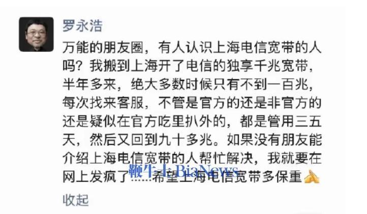 近日,罗永浩在朋友圈公开吐槽上海电信。